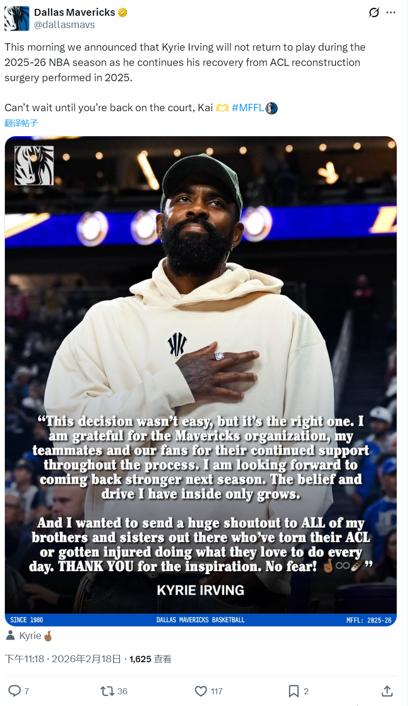 北京时间2月18日晚11点18分,独行侠官方宣布,凯里-欧文将因左膝伤势,本赛季正式报销。欧文接受ESPN采访时回应:“这个决定并不容易,但它是正确选择。感谢球队、队友和球迷,给予我的支持,我的信念和动力会越来越强!”