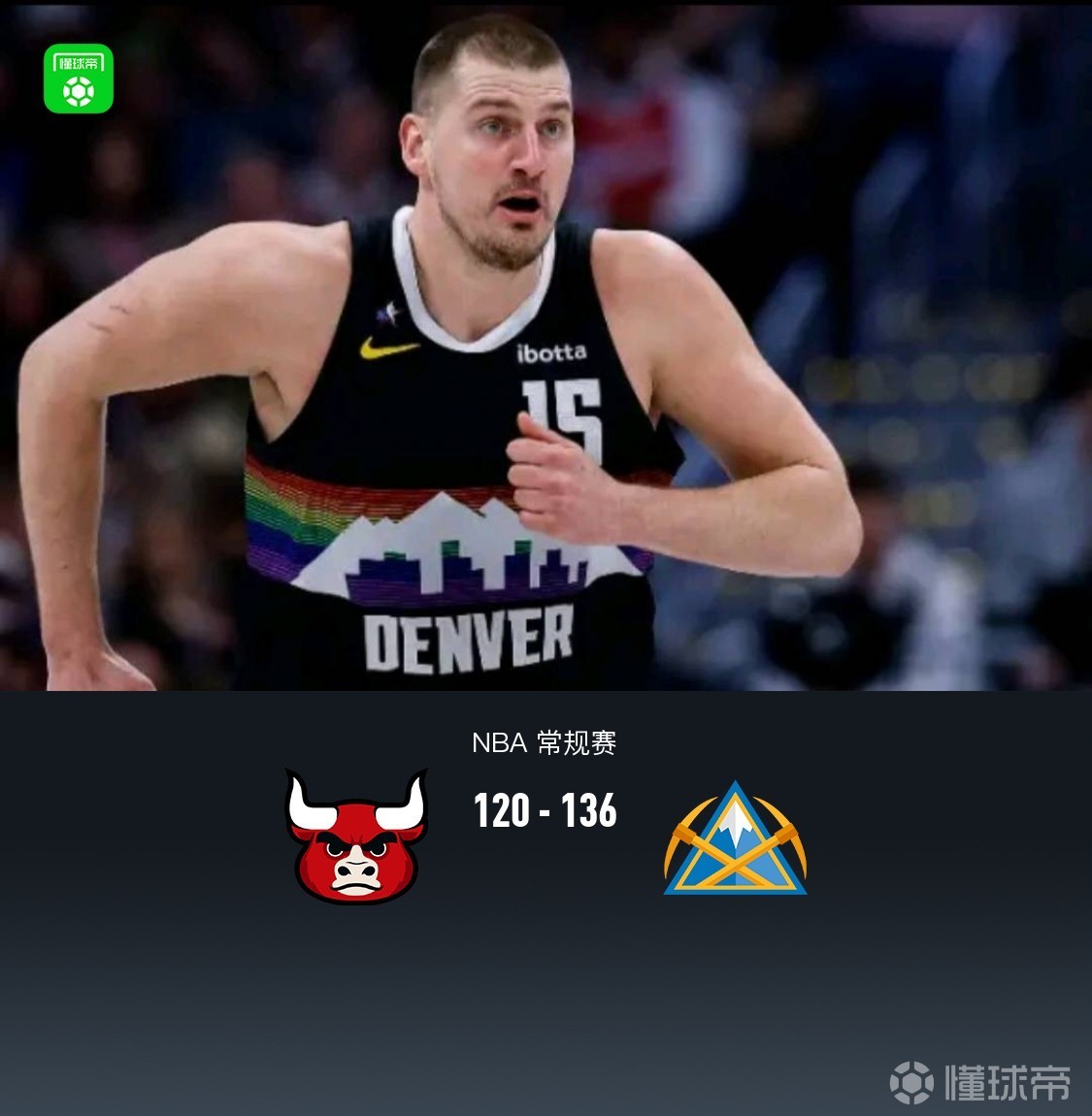 第四节,开节4分钟公牛持续哑火仅有2分入账,掘金在约基奇组织串联下一波20-2直接反超两位数,公牛理查兹、布泽利斯得分止血,掘金瓦兰、穆雷联手回应领先至15分,比赛还剩4分钟,穆雷伤退,公牛无力反扑,末节掘金轰出39-16,全场结束,公牛120-136不敌掘金。