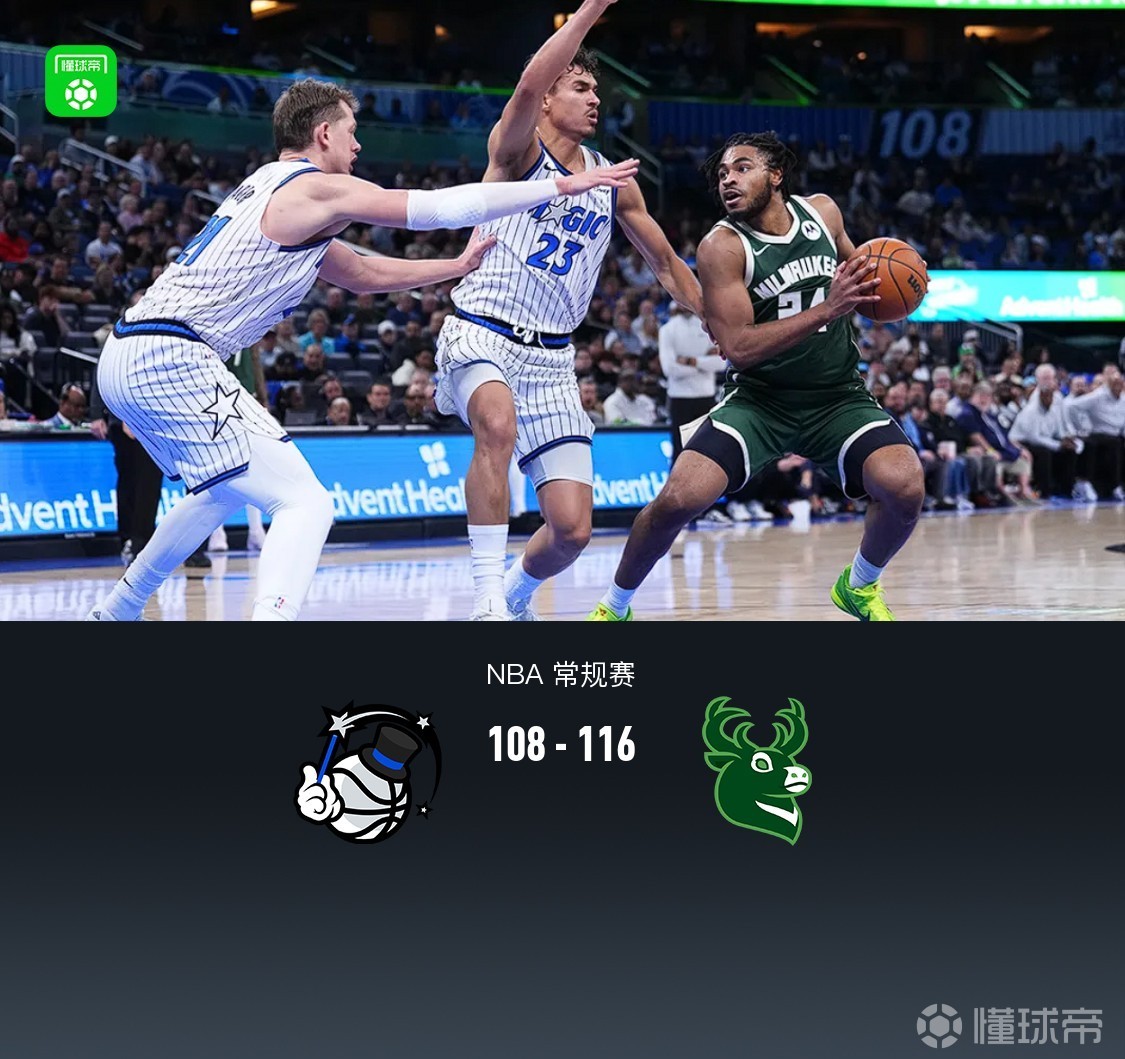 第四节魔术贝恩拿下11分,雄鹿托马斯拿下8分,最终魔术108-116不敌雄鹿