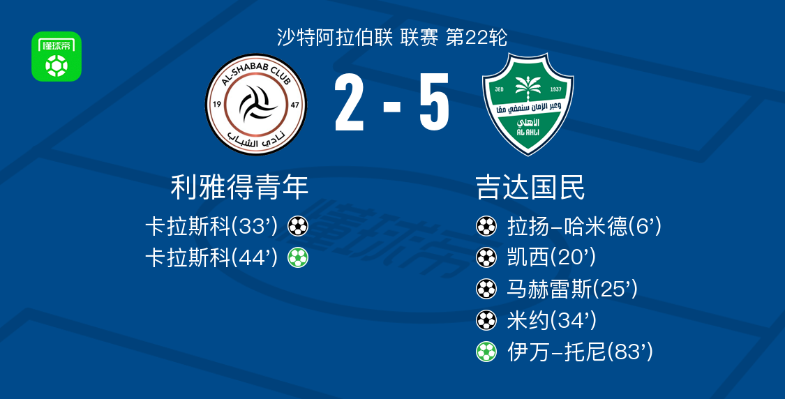 吉达国民5-2大胜利雅得青年,伊万-托尼点射、米约破门